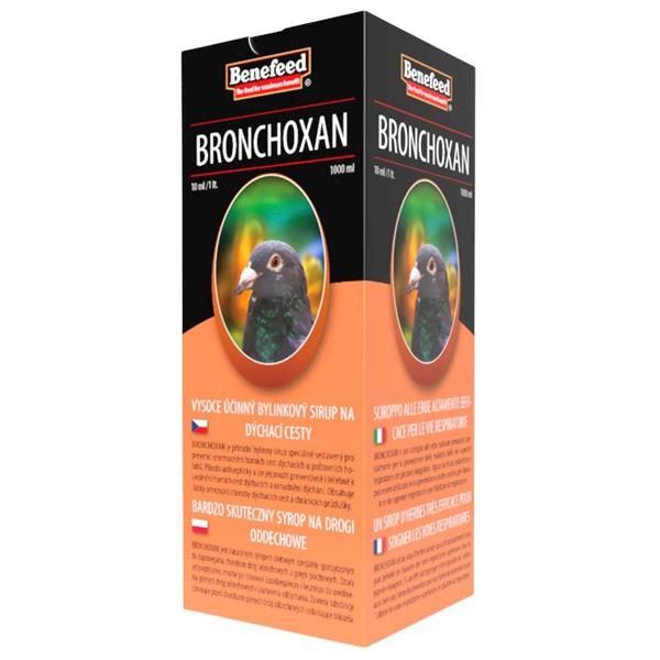 BRONCHOXAN je přírodní bylinný sirup speciálně sestavený pro prevenci onemocnění horních cest dýchacích u poštovních holubů. Působí antisepticky a lze jej použít preventivně i léčebně k uvolnění horních cest dýchacích a usnadnění dýchání. Obsahuje látky omezující choroby dýchacích cest a chránících průdušky. Významně omezuje záněty dýchacích cest a napomáhá jejich pročištění. V případě zánětu rozpouští hleny a usnadňuje vyměšování sekretu.