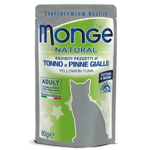 Monge Natural Adult Cat Yellowfin Tuna je doplnkové krmivo pre mačky s lahodnými, starostlivo pripravenými kúskami tuniaka. Kúsky sú varené v pare a obsahujú prirodzené zdroje Omega-3, vďaka čomu sú chutné a stráviteľné. Výber tichomorského tuniaka žltoplutvého – zdroja bielkovín s vysokou biologickou hodnotou, a Frukto-oligosacharidov (F.O.S.) – prebiotík pre zdravie čriev. Podporuje každodenné aktivity dospelej mačky s vysokou úrovňou energie. Vyrobené v Thajsku bez pridaných farbív a konzervačných látok. Cruelty-free, Dolphin Save a Sea Water Fish (ryba morskej vody).