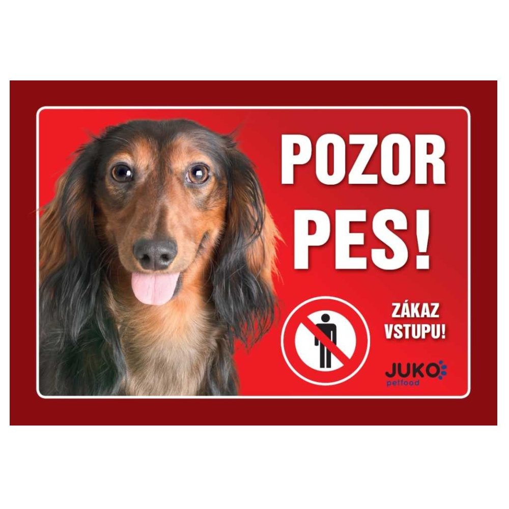 Bezpečnostné Plastová ceduľka/tabuľka Pozor Pes - Jazvečík dlhosrstý hnedý Na vonkajšie použitie - Ošetrené UV lamináciou pre zaistenie stálofarebnosti.
