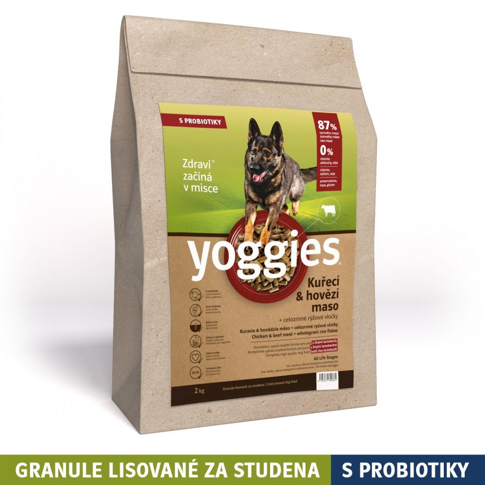 Díky svému obsahu čerstvého sušeného masa a jedinečnému obsahu chutí vůní i přírodních živin bez chemie jsou skvělým a kvalitním krmivem pro štěňata, dospělé i starší psy. Jako jediné granule tohoto typu na trhu obsahují probiotika (laktobacily), které podporují zdravý imunitní systém a obranyschopnost psa. Receptura granulí Yoggies je sestavena tak, aby měl váš pes požitek z chutí i vůní syrového sušeného masa (obsahují až 87% kvalitního syrového masa před sušením), tak z chroupání, které napodobuje kousání kostí. Tyto granule jsou lisovány za studena při teplotě max.38°C bez použití jakékoliv chemie. Jejich receptura je vyvinuta tzv. "All Life Stages" pro štěňata, dospělé i starší psy. VELIKOST GRANULÍ - BĚŽNÁ VELIKOST GRANULÍ pro štěňata větších plemen a dospělé psy středních a větších plemen. --------------------------------------------------- Každého pejska ohromí svou chutí i vůní napodobující čerstvou potravu v přírodě. Není nic horšího, než když by Váš pes měl onemocnět díky nekvalitní potravě. Proto je receptura granulí Yoggies vyvinuta tak, aby jejich chuť, vůně a především složení napodobovalo přirozenou a vyváženou kořist psa v přírodě. Právě proto jsou granule zaručeně bez lepku, sóji i jakékoliv chemie, plné přírodních vitamínů, bylinek a vyváženého obsahu kuřecího i hovězího masa. Yoggies granule lisované za studena pejskům skvěle chutnají a jsou mimořádně zdravé pro jejich trávicí systém i celkový vývoj a fit život. Vyrobeny bez jakékoliv chemie, lepku a sóji Suroviny jsou mlety "nahrubo". Granule tak mají i prebiotický efekt, což podporuje zdravou peristaltiku střev, čímž se také čistí střevní stěna od škodlivých usazenin a případných parazitů Proces lisování za studena (do 38°C) uchová důležité živiny v nezměněné formě! Skvěle se tráví a nebobtnají (v žaludku se rozpouštějí) a tím se snižuje riziko torze žaludku! Granule Yoggies obsahují až 87% kvalitního masa (před sušením). Díky tomu jsou špičkou na trhu Laktobacily udržují vyvážený imunitní systém i zdravý trávicí trakt psa! "All Life Stages" - pro štěně, dospělé i starší psy jako potrava v přírodě. Třeba pouze upravit krmnou dávku! Granule lisované za studena díky své tvrdosti čistí mechanicky chrup psa, pomáhají odstranit zubní kámen Díky své tvrdosti poskytují granule Yoggies psům požitek z chroupání jako by chroupali kost! ► Metabolizovaná energie_ 3820 kcal/kg Vyráběny jsou výhradně z kvalitních surovin, především syrového masa, které se pouze suší, melou a lisují do tvaru granulí (peletek). Laktobacily podporují imunitu i zdravý trávicí trakt, který také granule prebioticky čistí od usazenin. Jsou výborně stravitelné a nenabobtnají. Tím jsou pro psa snazší k trávení. Jejich nutriční hodnota je propočítána tak, aby krmná dávka vyhovovala pro malá, střední i velká plemena štěňat i dospělých psů v běžné zátěži. Pokud používáte Yoggies granule lisované za studena pro krmení Vašeho psa, pak si můžete být jisti, že i podle názoru veterinářů mu dáváte jedno z naprosto nejkvalitnějších krmiv na trhu a tím pomáháte předcházet riziku mnoha nemocí z nevhodného a nezdravého krmení a také torze žaludku. Skladování: Skladujte v chladu a suchu. Neuzavírat do vzduchotěsných nádob. Co jsou granule lisované za studena s příměsí laktobacilů: Běžné granule jsou dnes vyráběny procesem extrudace. To je proces, při kterém se nejdříve vyrobí z různých surovin těsto (podobnému paštice), které poté prochází procesem extrudace, kdy se zbaví vody díky velkému tlaku a teplotě až 200°C. Při tomto procesu je bohužel zničena většina přírodních živin a vitamínů. Tyto důležité živiny mohou být do granulí poté přidány pouze jedinou, bohužel chemickou cestou. Yoggies granule lisované za studena jsou svou chutí i vůní blíže přírodě. Již z výroby si zachovávají přirozenou chuť, vůni a výživové hodnoty díky lisování za studena (do 38°C). Suroviny jsou pečlivě vybírány, sušeny, mlety a poté jen lisovány do tvaru granulí. Yoggies granule mají přirozené výživové složení získané ze surovin použitých k výrobě. Obsahují maso, ovoce, bylinky, látky prospěšné pro vývoj i vitalitu psa a také příměs živých laktobacilů. Ty se v těle psa postarají o podporu střevní mikroflóry, posílení imunity a budoucí dobré zdraví psa a spokojenost chovatele. Yoggies granule lisované za studena s laktobacily jsou vyvinuty jako "All Life Stages" pro štěňata, dospělé i starší psy. V tomto balení naleznete BĚŽNOU VELIKOST GRANULÍ, které jsou vhodné pro štěňata středních a velkých plemen a dospělé psy středních i velkých plemen. Baleno EKOLOGICKY v recyklovatelném papírovém pytli.