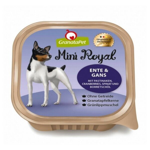 Konzerva GranataPet Mini Royal kachna a husa s pastinákem, brusinkami, špenátem a borákovým olejem: