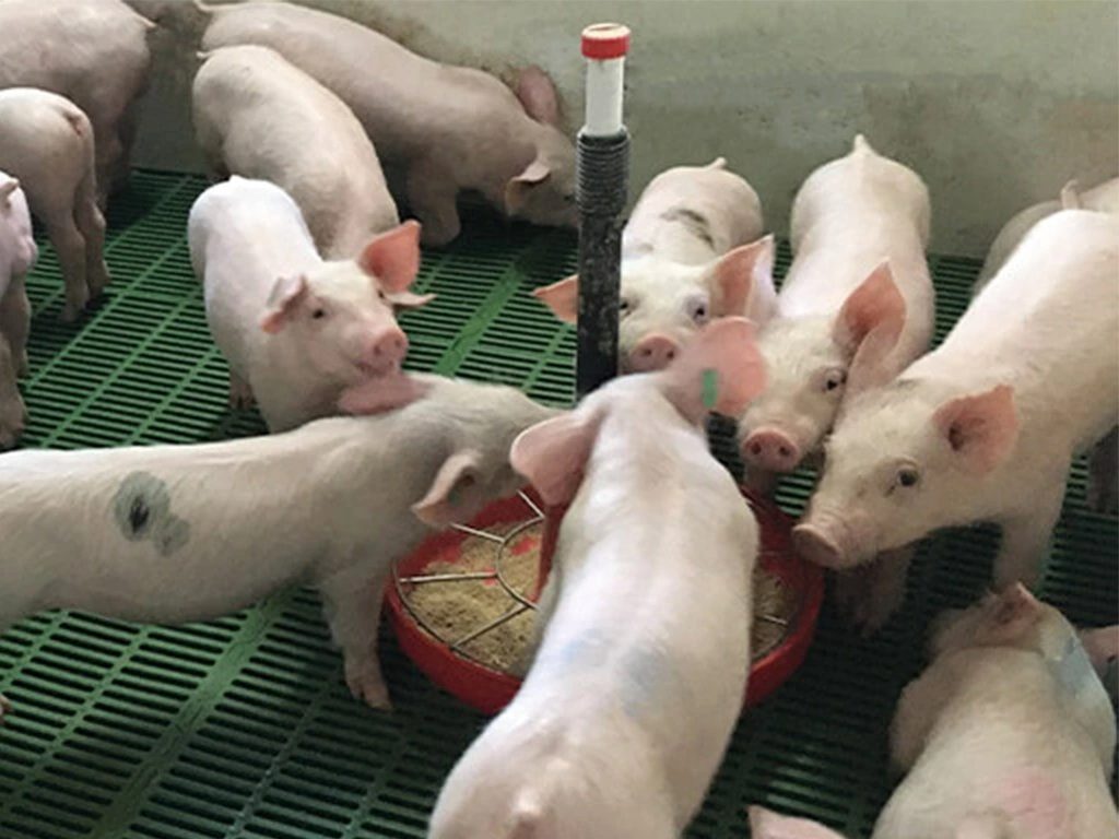 Adaptivní krmítko, pro krmení selat při odstavu, jednoduché připevnění k roštu, snadná údržba, 10 krmných míst, objem misky 9 l, průměr misky 42,5 cm, výška krmítka 68 cm.
