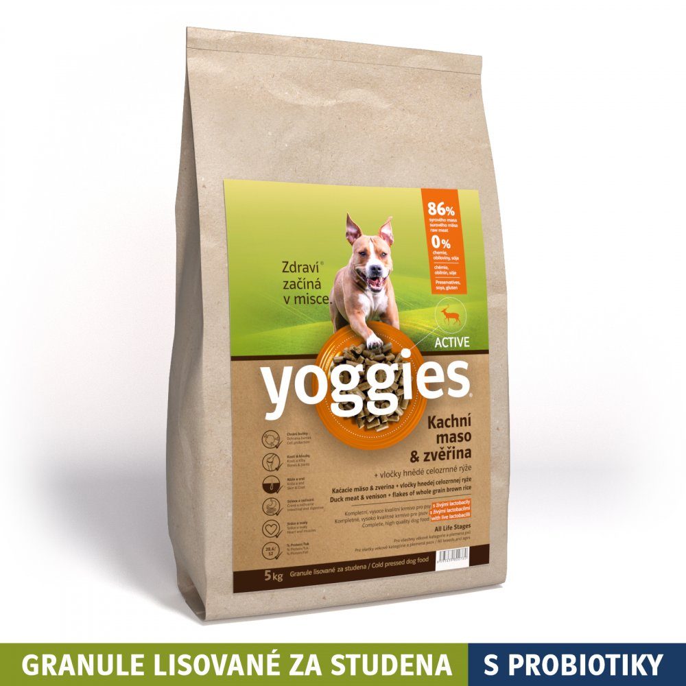 Za studena lisované granule Yoggies obsahují 86 % kvalitního masa před sušením – tzn. před ztrátou vody, která se v masu přirozeně vyskytuje. Po vysušení masa se tak objem zredukuje na cca 35-40 % celkové původní váhy. Probiotika v granulích podporují imunitu i zdravý trávicí trakt. Jsou výborně stravitelné a nebobtnají (potlačují riziko torze žaludku).